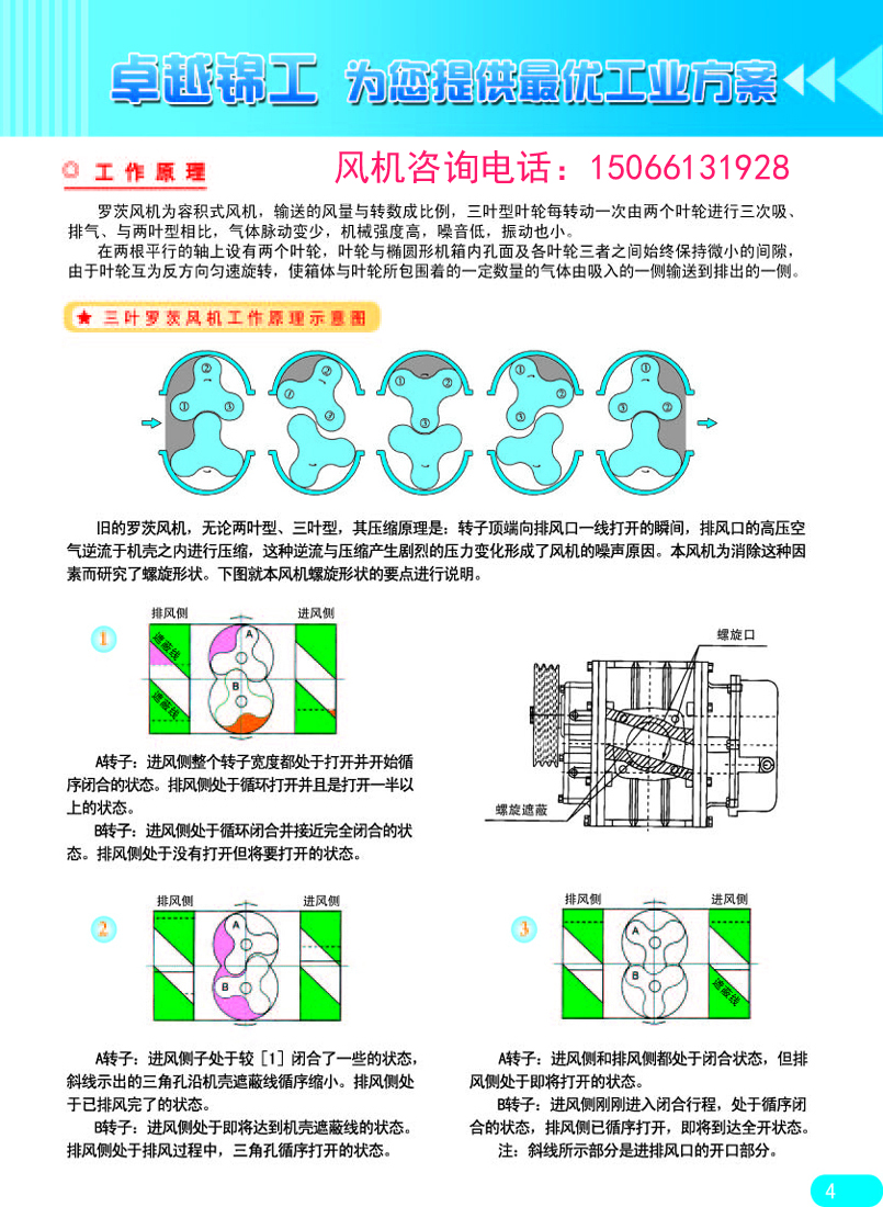 舊的羅茨鼓風機,無論兩葉型、三葉型,轉子頂端向排風口一線打開的瞬間,排風口的高壓空氣逆流于機殼之內進行壓縮,從而產生劇烈的壓力變化,形成了風機的噪音。本風機為消除這種因素而研究了螺旋形狀。詳細了解三葉羅茨風機與兩葉羅茨風機性能對比文章地址:http://www.taifenggroup.cn/archives/3690