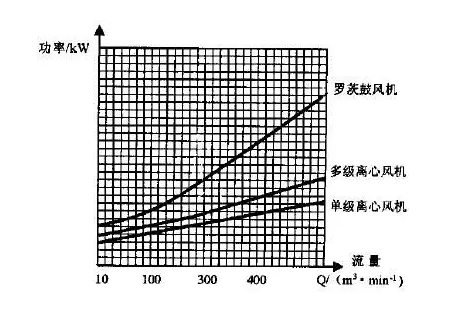 三種風(fēng)機(jī)的能耗對(duì)比見:三種風(fēng)機(jī)流量—功率曲線圖(見圖1) 。在流量較小時(shí),三種風(fēng)機(jī)效率差異不是很顯著;對(duì)于大流量風(fēng)機(jī),由于羅茨式轉(zhuǎn)速無法提高,效率較低;另兩種離心風(fēng)機(jī)差距較小。