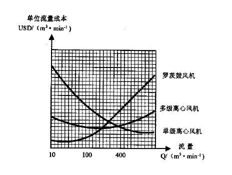 三種風(fēng)機(jī)的投資成本對(duì)比見:三種風(fēng)機(jī)流量—單位流量成本曲線圖(見圖2)。從上面曲線圖可以看出: