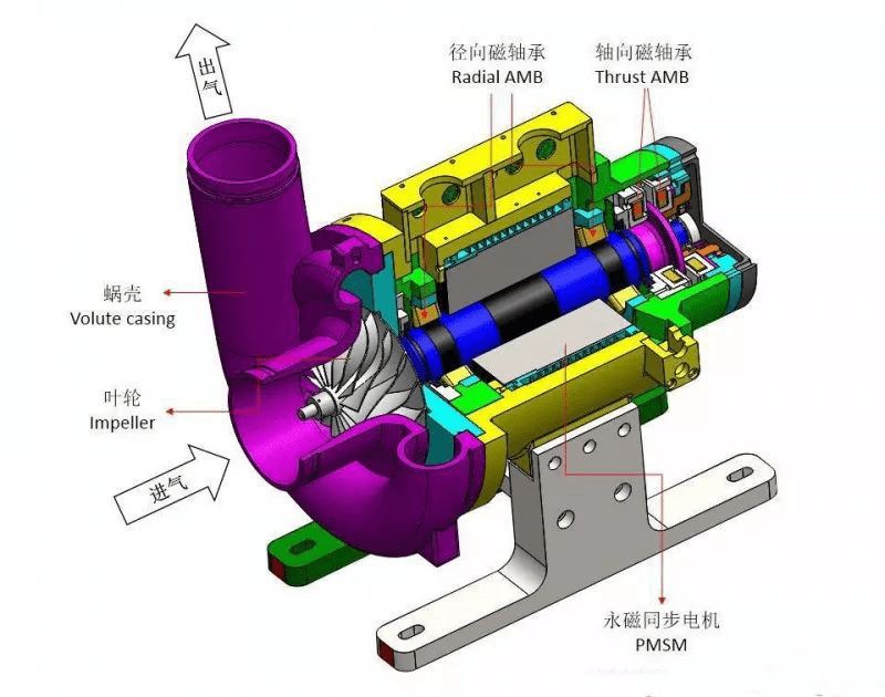空氣懸浮離心鼓風機是一種全新概念的離心鼓風機,借鑒航空、航天器的渦輪發動機,應用先進的空氣懸浮技術,采用了“高效永磁電機”和“空氣懸浮軸承”這兩個高端核心技術,改善了傳統單級高速渦輪鼓風機的轉速齒輪、聯軸器、冷卻系統和油潤滑系統等,大大提高了產品的技術性能及運行可靠性。避免了噪音、振動以及廢棄潤滑油等對環境造成的二次污染,大大減少了設備維護工作量,節約了設備維護成本。