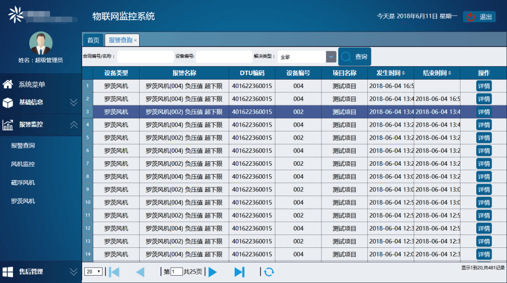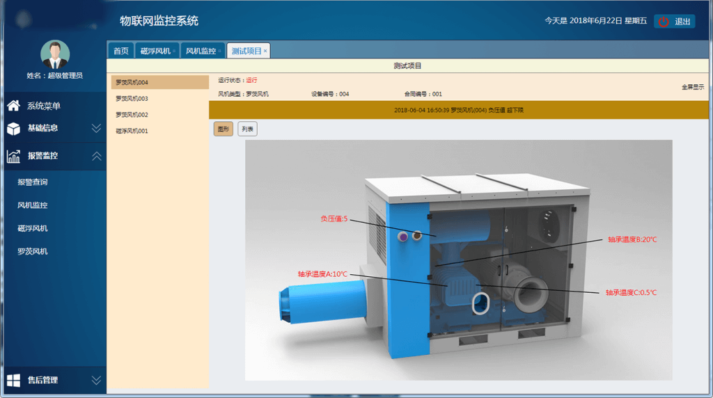 羅茨風機本體上安裝有溫度傳感器、振動傳感器、噪聲傳感器等傳感設(shè)備,實時采集電機繞組和軸承溫度、羅茨風機振動及噪聲數(shù)據(jù)并上傳到控制柜。
